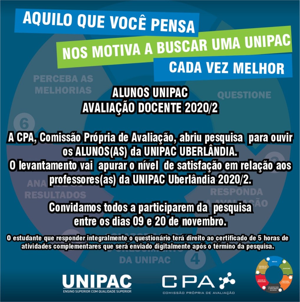 A CPA da UNIPAC está realizando no período de 09 a 20 de Novembro a Avaliação Docente 2020.2. Conto com a colaboração e participação de todos! É muito importante para nós ouvir a opinião de cada um de vocês!