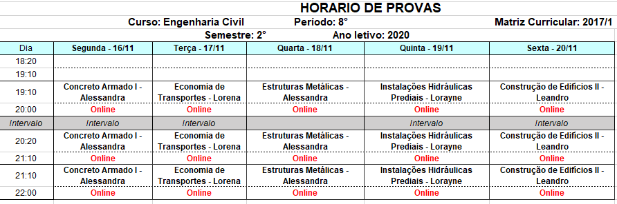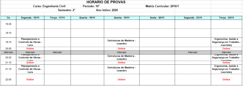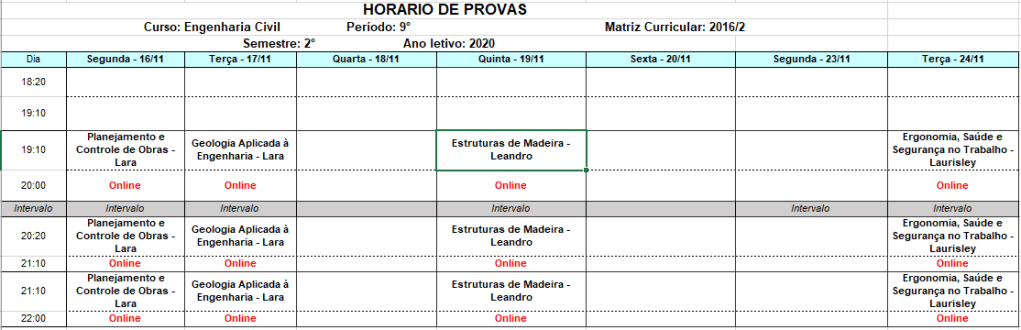 Seguem os horários das avaliações A3: