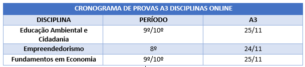 Seguem as datas e horários das provas A3 das disciplinas online.
