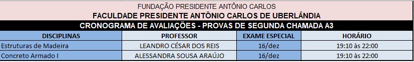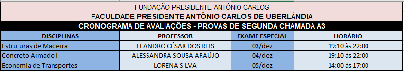 Segue o cronograma de prova de Segunda Chamada da A3